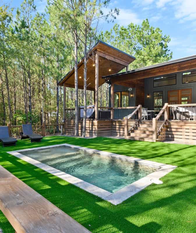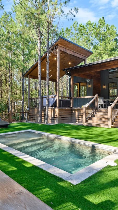 What can you expect from a stay in our Float On cabin? This luxury cabin with a hot tub and a private swimming pool sleeps up to 7 guests and offers the perfect setting among nature for a family vacation or a fun weekend with friends. Whether lounging by the outdoor fireplace, playing games inside, or exploring the great outdoors just minutes away, every moment can be packed with as much fun – or relaxation – as you’d like.